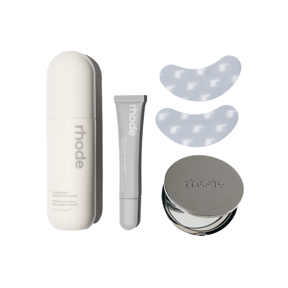 Take your rhode on the go. Four essentials to throw in your bag for a quick skincare refresh whenever you need it. Peptide Eye Prep to depuff and brighten under eyes, Glazing Mist to hydrate and refresh skin with next-level glow, Peptide Lip Treatment for pillowy-soft, replenished lips, and our signature compact mirror for effortless touch-ups.